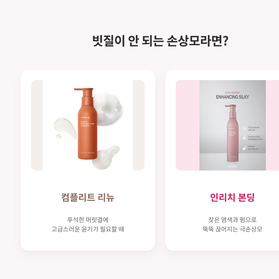아윤채 샴푸 인기는 단순히 빠지는 머리만 보는 게 아니에요. 미용실에서 쓰는 브랜드답게 모발까지 챙기는 라인이 잘 짜여 있어요. 인리치 본딩 샴푸는 잦은 염색과 열기기로 탄력이 떨어진 머리를 위한 모발 건강 샴푸예요. 손상 부위를 채워 주는 느낌의 사용감으로, 탈모 케어와 헤어 케어를 같이 하고 싶은 분들이 많이 찾습니다. 두피는 리밸런싱으로 관리하고, 길이에는 인리치 본딩이나 다른 케어 라인을 더해 쓰면 집에서도 살롱 케어에 가까운 조합이 돼요. 이렇게 두피와 모발을 함께 잡아 주니 자연스럽게 탈모샴푸 순위에서도 눈에 들어오고, 두피 관리 샴푸 찾는 사람에게도 만족도가 높은 편입니다.
